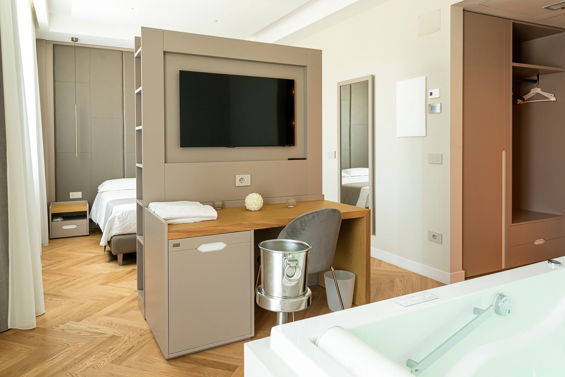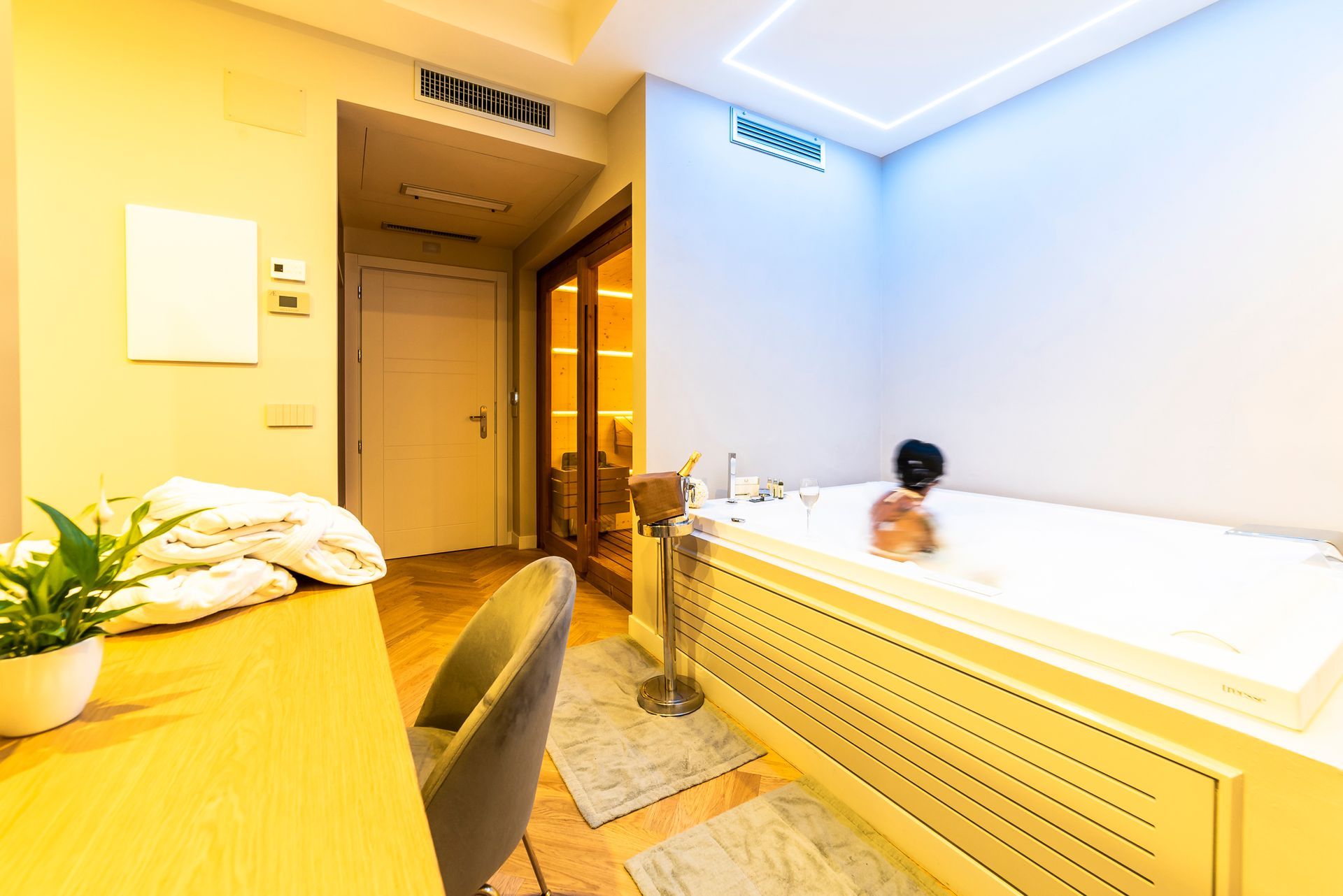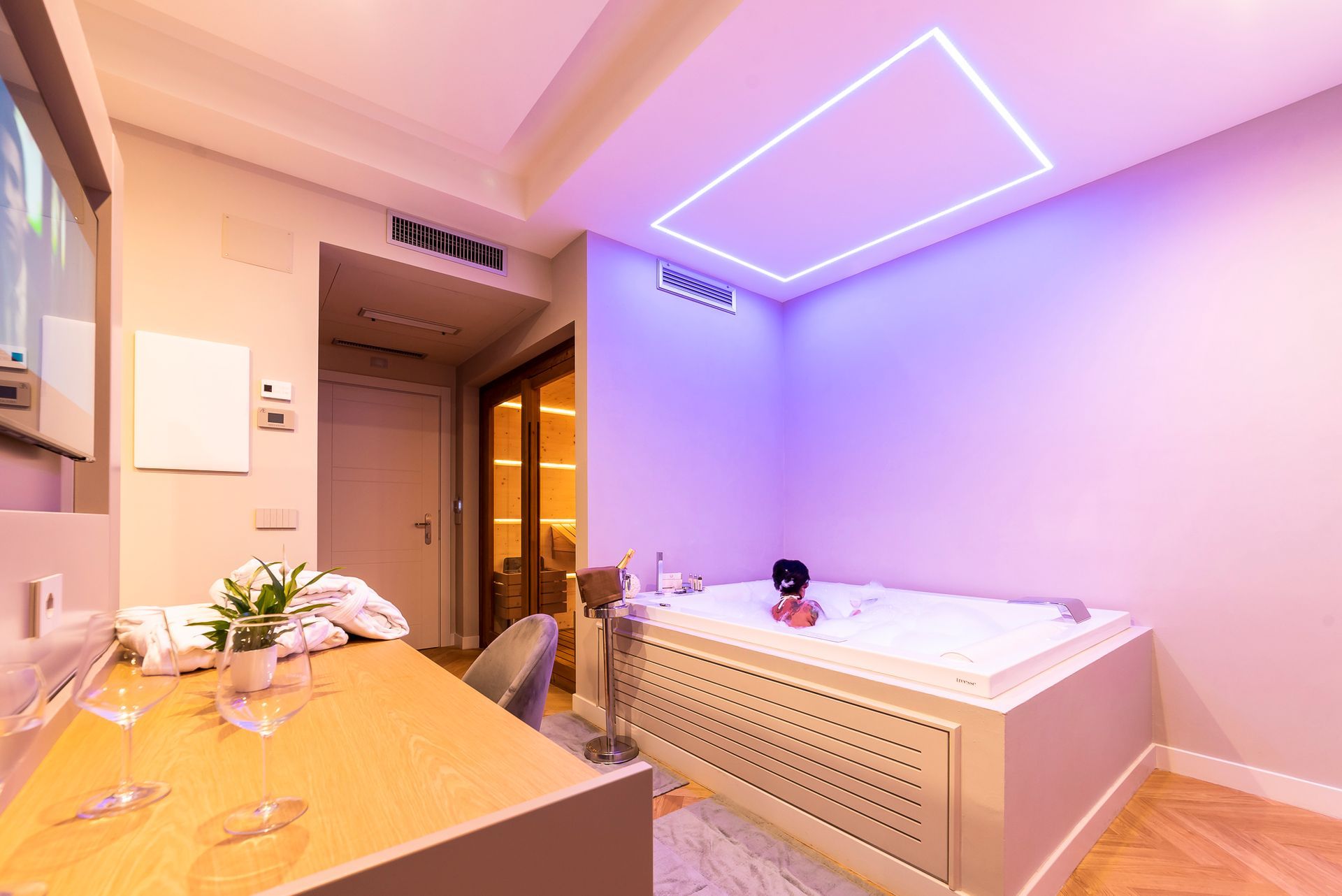 Questa suite dispone di vasca idromassaggio e sauna. Questa suite dispone di 1 soggiorno, 1 camera da letto separata e 1 bagno con vasca e set di cortesia. La suite dispone di aria condizionata, TV a schermo piatto con servizi streaming, pareti insonorizzate, minibar, armadio e vista sulla città. L'unità dispone di 1 letto.
